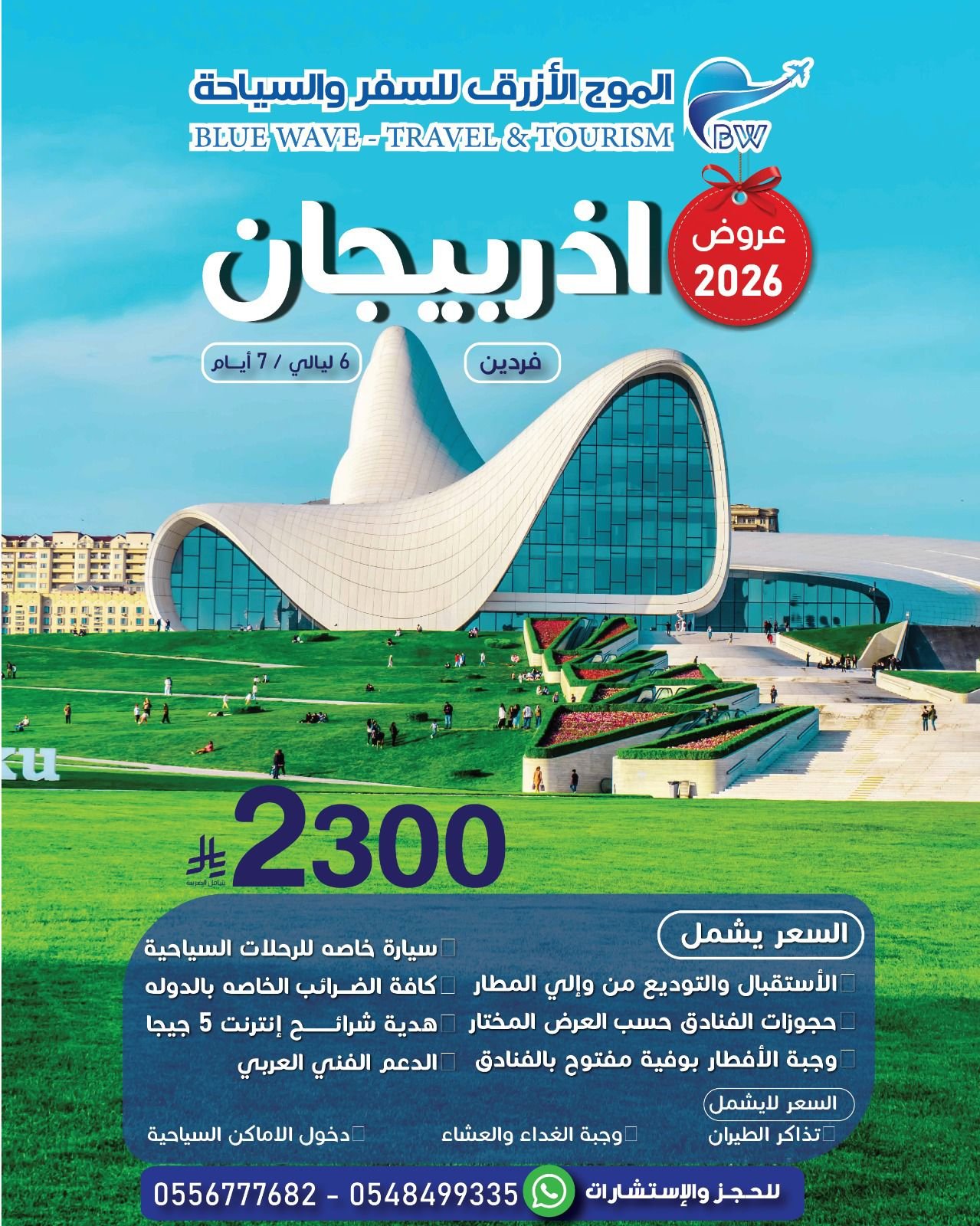 انطلق في رحلة ساحرة إلى اذربيجان في 2026 مع شركة “الموج الأزرق”، واستمتع بتجربة فاخرة لشخصين تجمع بين الطبيعة الخلابة، الثقافة الغنية، والفخامة العصرية، برنامج الرحلة متكامل ويضمن الراحة الكاملة، الجولات الخاصة، والإقامة في أفضل الفنادق، مع دعم متواصل باللغة العربية لجعل رحلتك لا تُنسى.